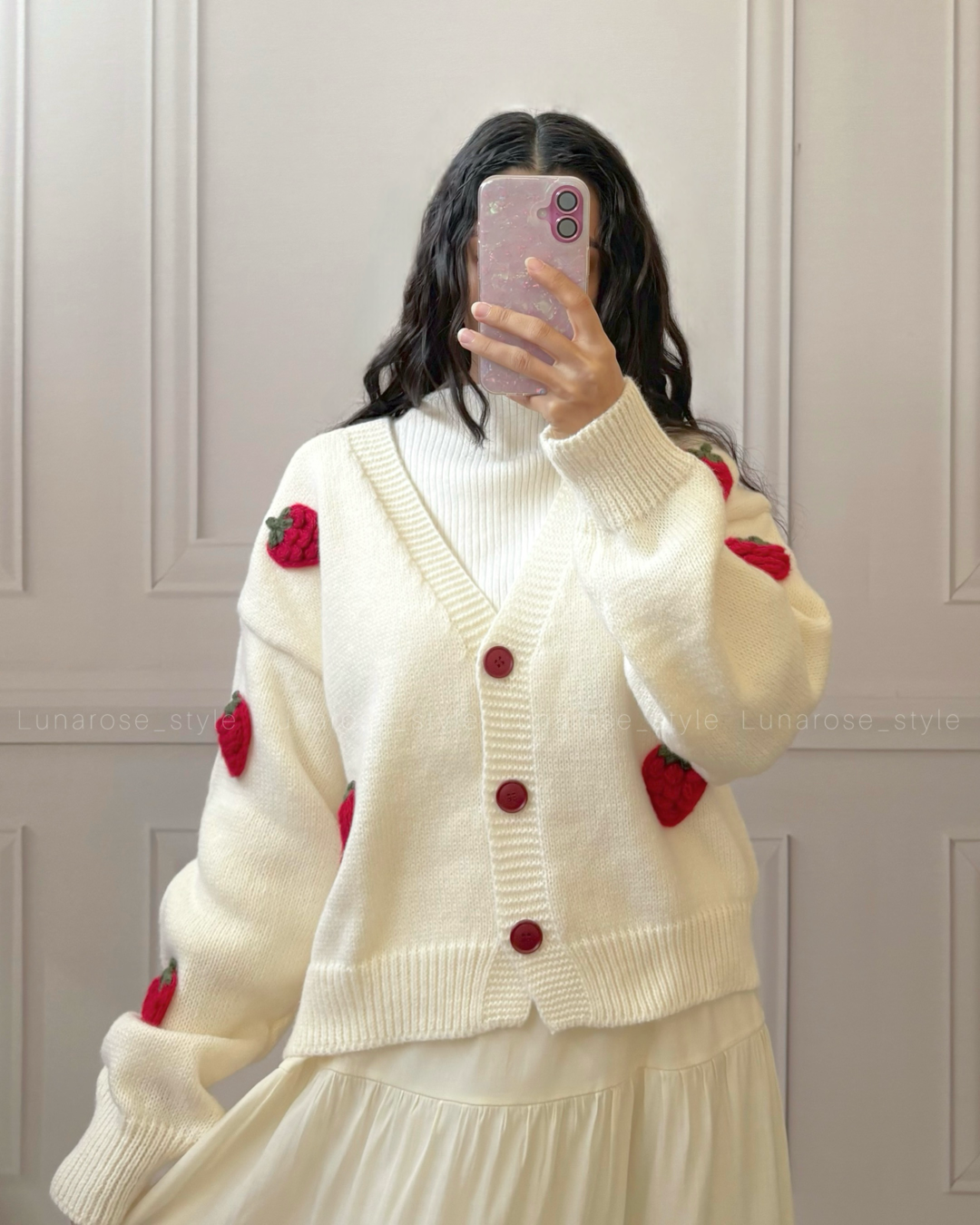 کاردیگن وارداتی نرم و لطیف گرم بالا دکمه ها باز می شود در دو رنگ زیبا توت فرنگی ها جدا نمی شود فری سایز تا ۴۴-۴۶